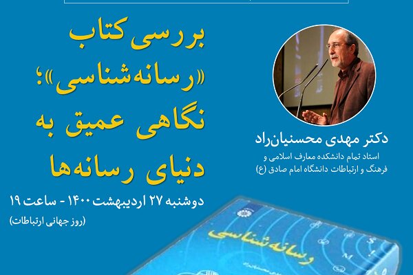 نشست نگاهی عمیق به دنیای رسانه ها با نگاهی به کتاب «رسانه شناسی» نوشته محسنیان راد، همزمان با روز جهانی ارتباطات، روز دوشنبه ۲۷ اردیبهشت ماه برگزار می شود.